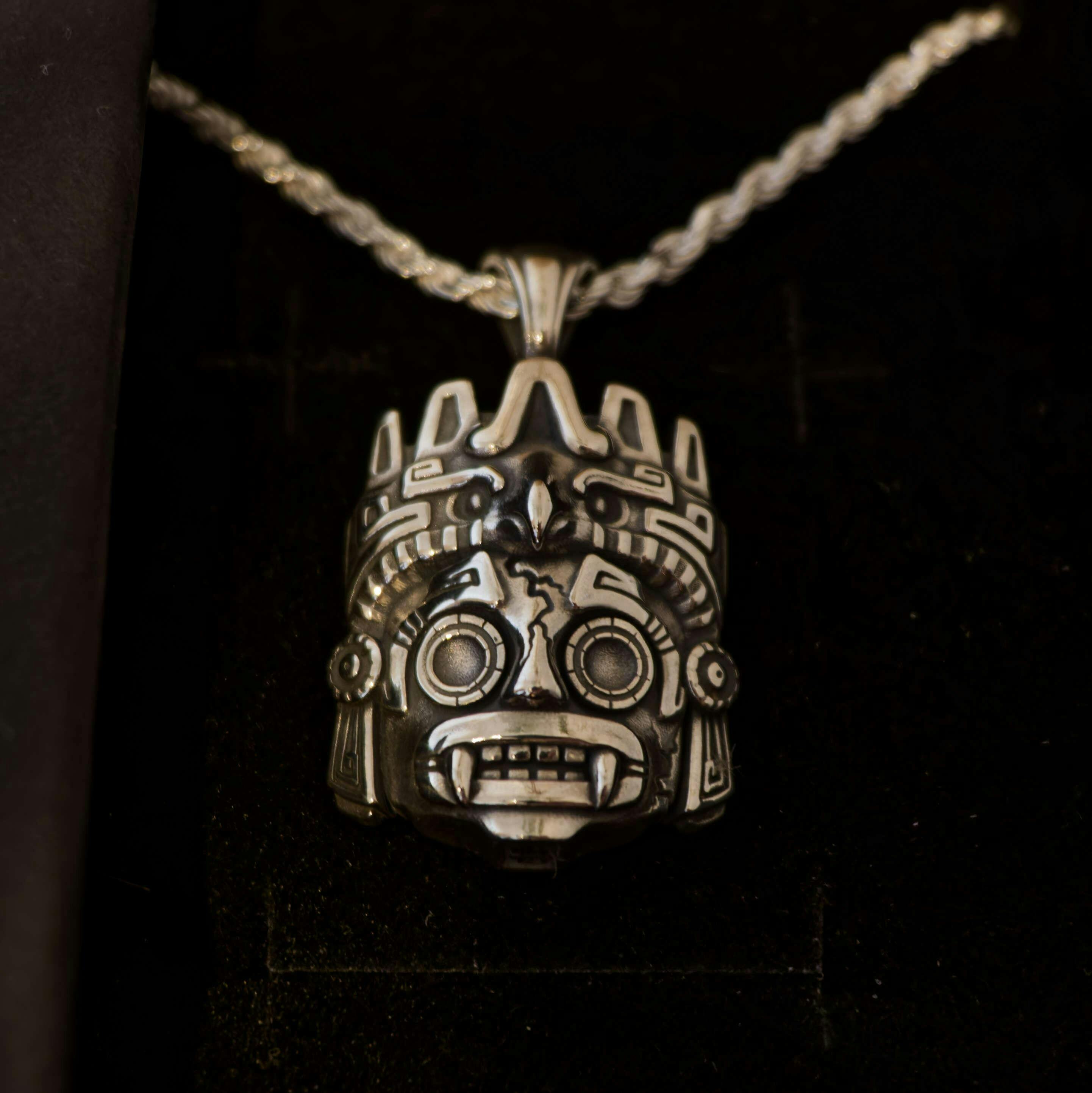 This intricate Aztec pendant, handcrafted in sterling silver, is inspired by the ancient god of storms.